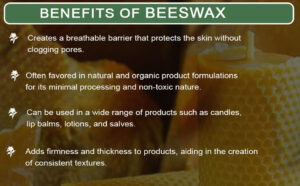 Beeswax acts as an excellent emollient, locking in moisture and protecting the skin from dryness. It forms a breathable barrier on the skin, keeping it soft, smooth, and hydrated without clogging pores.