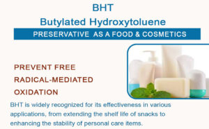 In food, BHT acts as a preservative in products containing fats and oils, such as snacks, cereals, baked goods, and processed foods, maintaining natural flavor, aroma, and appearance. In cosmetics and personal care products, including lipsticks, lotions, and skincare, BHT prevents oils and fat-soluble ingredients from oxidizing, ensuring smooth, uniform, and rancidity-free formulations.