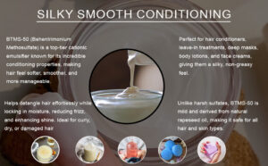 In hair masks and deep conditioning treatments, BTMS-50 strengthens and nourishes hair, reducing frizz and repairing minor damage.