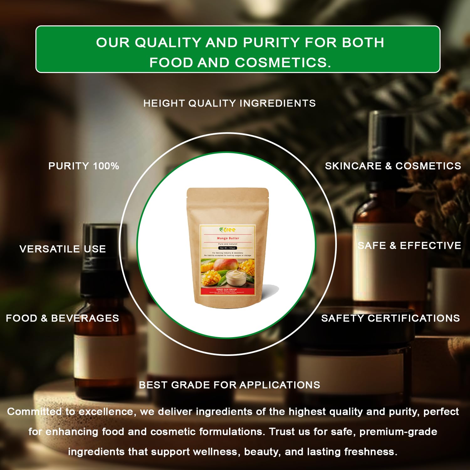 Mango butter can be applied to the body, face, hands, elbows, knees, and other dry areas. Its lightweight texture ensures quick absorption without a greasy feel.