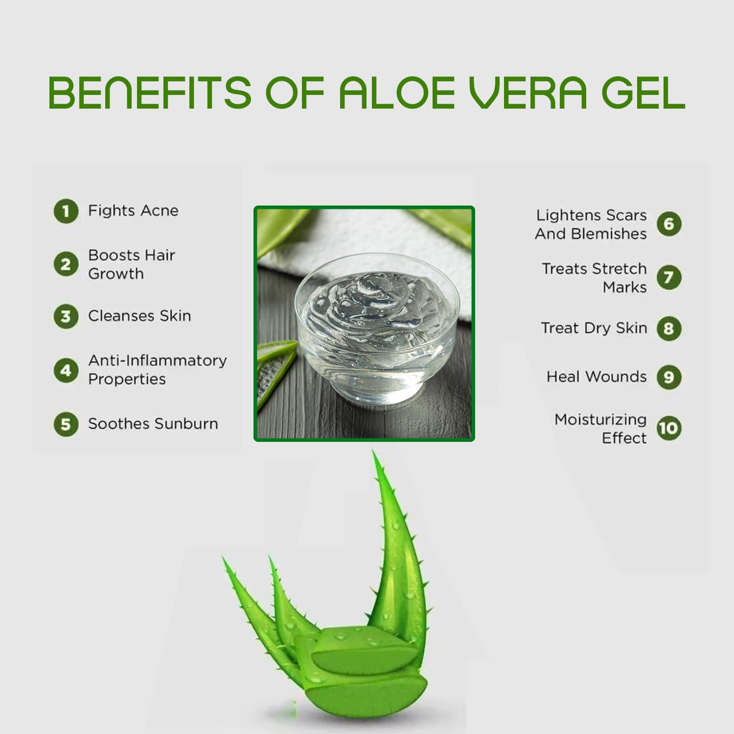 Aloe vera gel provides intense moisture to the skin and hair, helping prevent dryness and maintaining soft, supple skin. Its lightweight formula absorbs quickly without leaving a greasy feel.