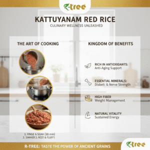 Bring home the richness of Indian heritage with R-Tree Kattuyanam Red Rice, a rare and ancient rice variety once eaten by kings and warriors for strength, stamina, and longevity. This naturally grown, chemical-free red rice is packed with powerful nutrients, making it a perfect choice for modern health-conscious families.