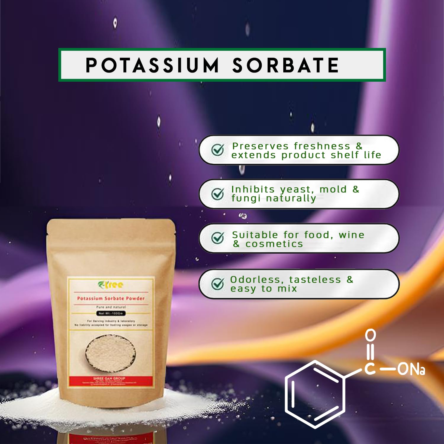 R-Tree Potassium Sorbate is a premium-quality, high-purity food-grade preservative widely trusted for extending the shelf life of food, beverages, cosmetics, and personal care products. Known for its effectiveness against mold, yeast, and fungi, it helps maintain freshness, taste, and safety without altering the flavor or aroma of your product.