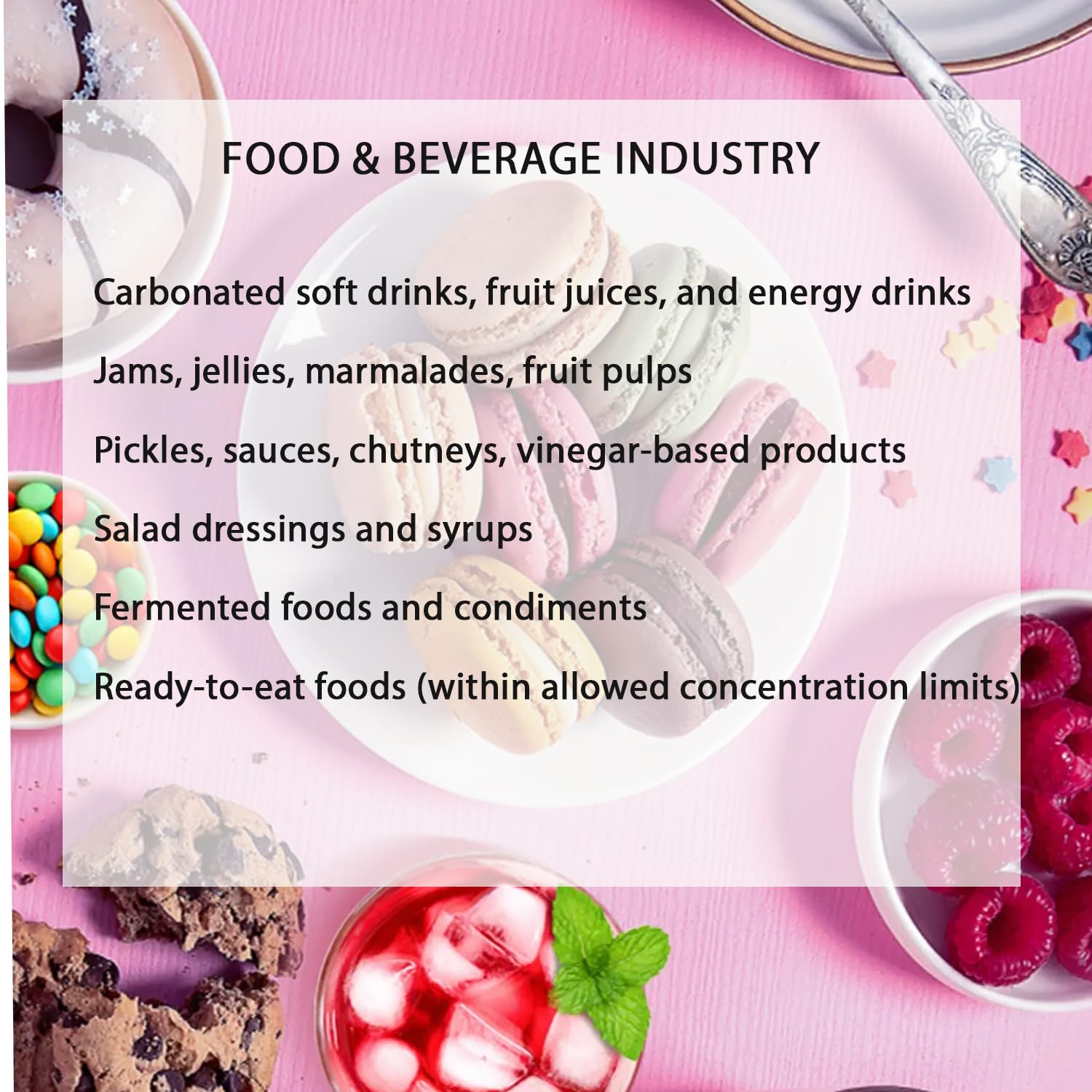 Used in soft drinks, fruit juices, sauces, salad dressings, and canned goods to prevent spoilage, maintain flavor, color, and texture, and ensure a longer shelf life.