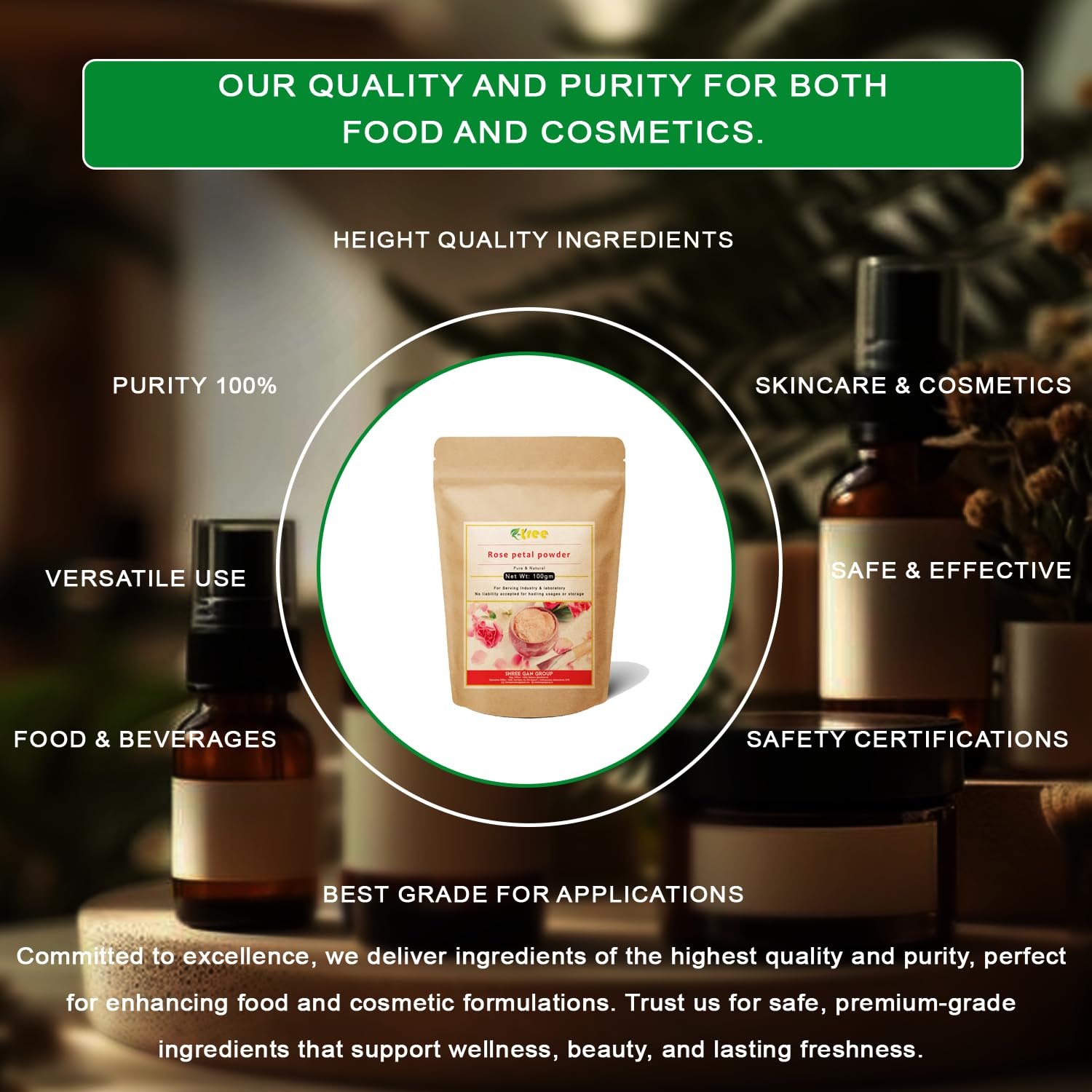 R-Tree Rose Petal Powder is a 100% organic and versatile product suitable for both cosmetic and culinary applications. In skincare, it is widely used in face masks, scrubs, and creams to soothe the skin, reduce redness, and maintain its natural pH balance. Its astringent properties help tighten and tone the skin, making it ideal for oily and acne-prone skin types.